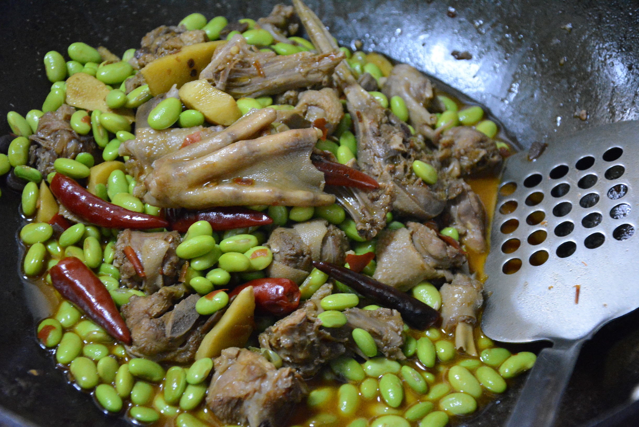 材料:青豆,鸭子半只,辣椒,豆瓣,姜,鸡精,盐