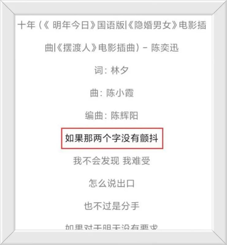有人说陈奕迅的十年是唱给杨千嬅的,其实并不是,这首歌是林夕写的,创作的源泉来自于他听到的一个故事。
