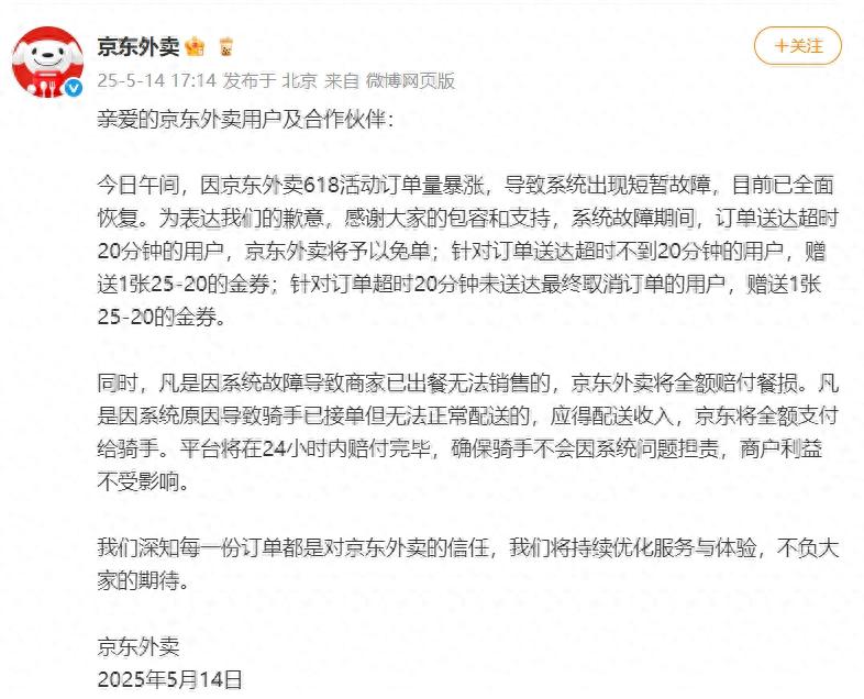 亲爱的京东外卖用户及合作伙伴:今日午间,因京东外卖618活动订单量暴涨,导致系统出现短暂故障,目前已全面恢复。为表达我们的歉意,感谢大家的包容和支持,系统故障期间,订单送达超时20分钟的用户,京东外卖将予以免单;针对订单送达超时不到20分钟的用户,赠送1张25-20的金券;针对订单超时20分钟未送达最终取消订单的用户,赠送1张25-20的金券。