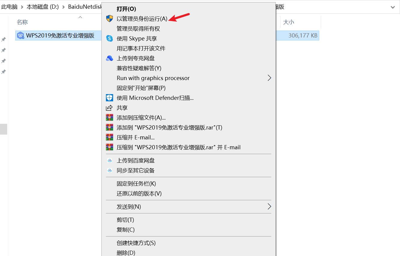 2、解压安装包之后,找到WPS2019免激活专业增强版程序,右键以管理员身份运行。