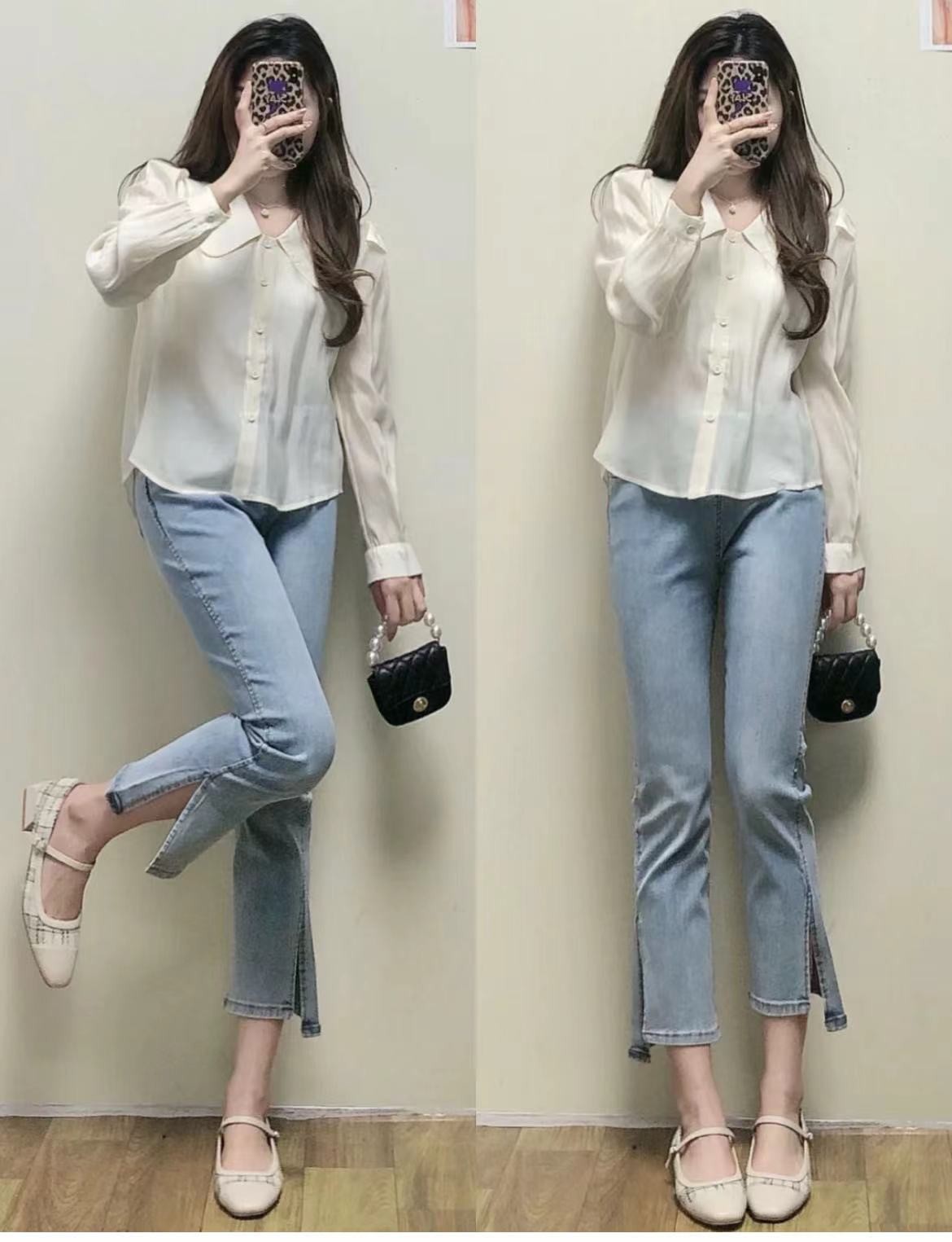 小个子女生也很适合搭配长款的直筒开叉牛仔裤,穿起来会更显高一些,而且浅色系也会给人一种温柔感,开叉设计的牛仔裤看起来好像更时尚,更高级。