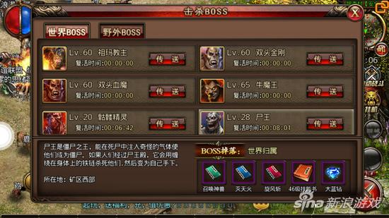 沙巴克传奇尸王是出没在矿区西部的一个“世界BOSS”,小伙伴们可以在28级之后通过传送直接前往当前地图来进行挑战,尸王刷新时间还是比较快的,而且他的难度也不是很高,小伙伴们可以在线来等着刷新。