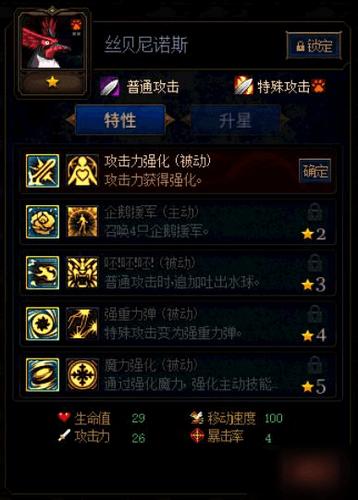 丝贝尼诺斯这一张卡牌是生存能力比较强的输出卡,如果阵容坦克不多可以点生命力强化,有坦克建议选择攻击力强化,其他技能推荐:企鹅援军、呸呸呸、强重力弹、魔力强化。