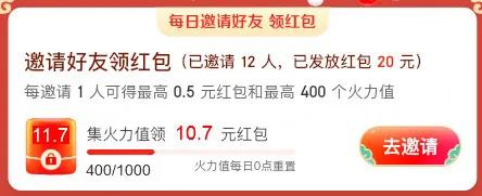 可为邀请人增加助力人数。每邀请1人助力均可获得最高0.5元的助力红包和最高 20点火力值。每日累计 1000点火力值,可额外领取 10.7 元超大额红包,每日最多领取 1 次。火力值进度每天 24 点重置。如果已达成
