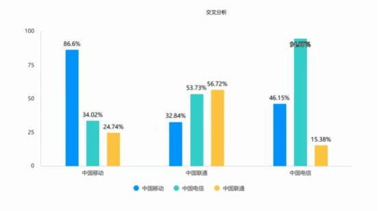 同时我们通过交叉分析数据的方式可得,认为中国移动网速比较好的同学手机卡的使用情况如下:中国移动占86.6%,中国电信占34%,中国联通占24.7%。认为中国联通网速比较好的同学手机卡的使用情况如下:中国移动占32.8%,中国电信占53.7%%,中国联通占56.7%。认为中国电信网速比较好的同学手机卡的使用情况如下:中国移动占46.2%,中国电信占94.9%,中国联通占15.4%。