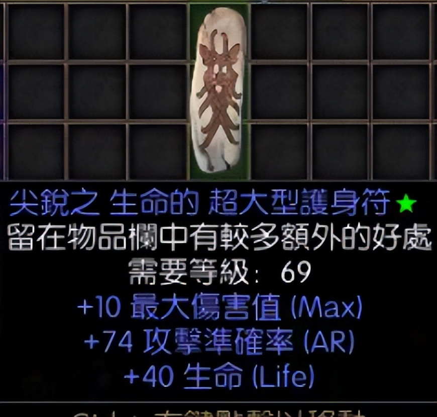 20法力,17生命的小型护身符。两条都是满变量,这件物品几乎是每个PK玩家必备的小护身符。这种满变的极品价格自然也不低,市场价大概在40元左右。