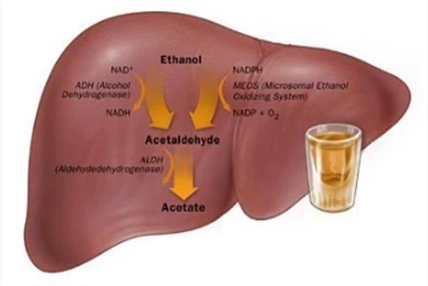酒精在人体中代谢要经过两个步骤:第一步:酒精(主要是乙醇)在乙醇脱氢酶的作用下,被转化为乙醛;第二步:乙醛在乙醛脱氢酶(ALDH)的作用下,被转化为乙酸。最后分解成二氧化碳和水排出体外。人体若是具备这两种酶,就能较快地分解酒精,中枢神经就较少受到酒精的作用。