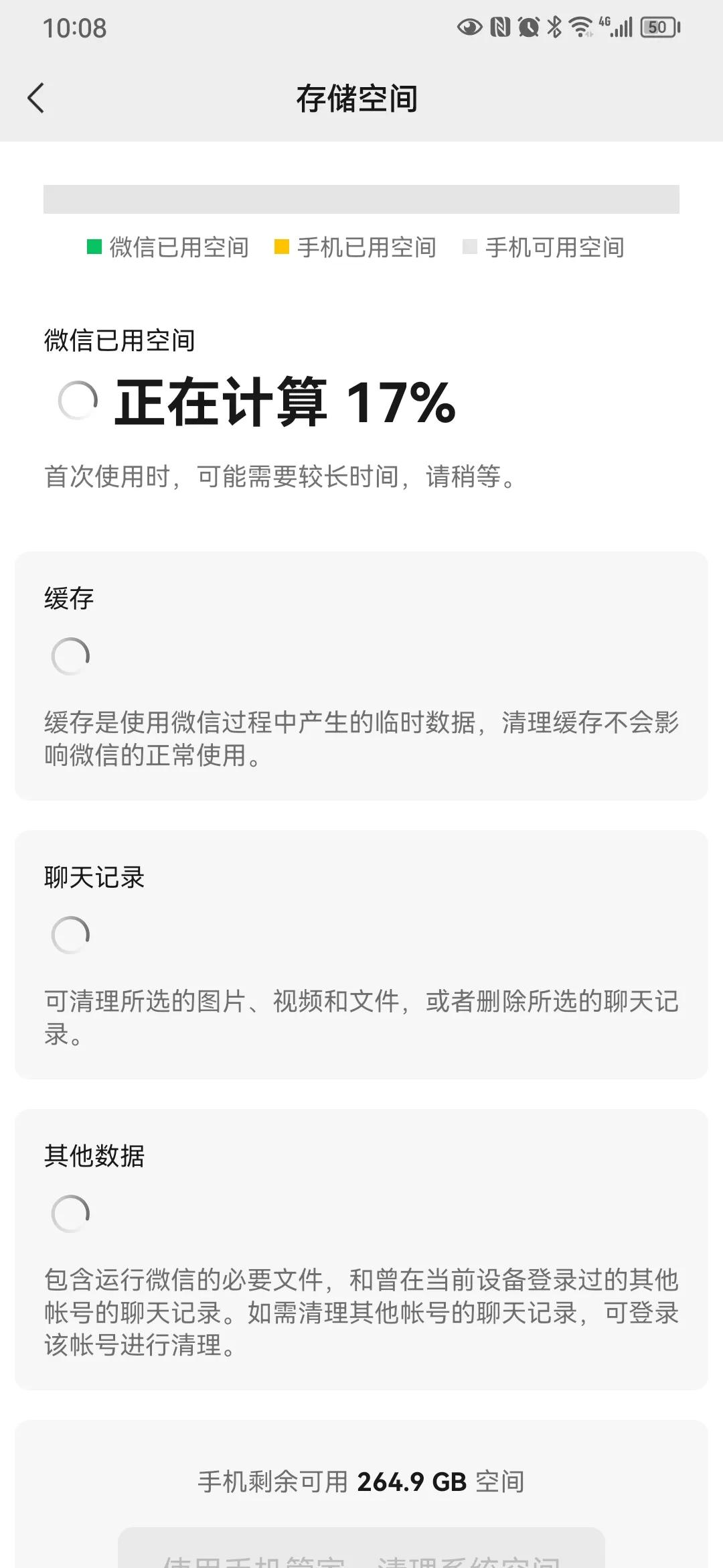 打开微信—设置—通用—存储空间#存储空间#,这时候会自动跳到自动计算页面,这个时候等待一会儿,计算完成100%后就可以选择性的清理了