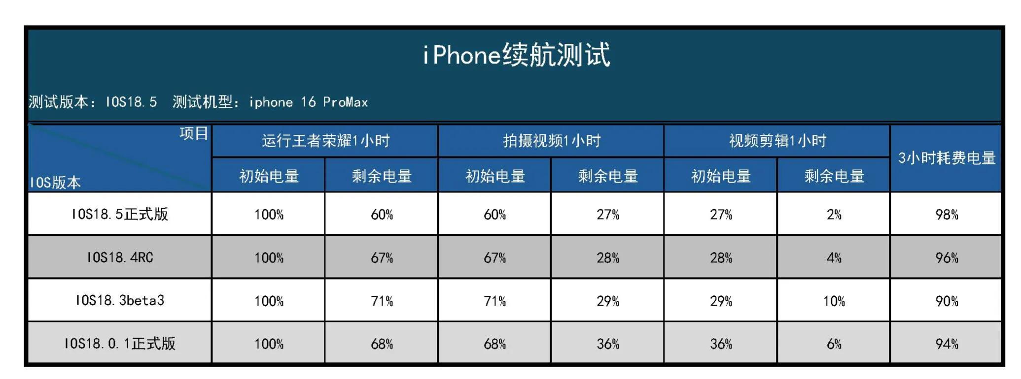 这是用户最关心的指标之一,因为我是从今天早上开始测试的,所以时间有点仓促,不能做长时间的高强度评测,不过呢,以下的测试数据是绝对真实的,续航来讲,IOS18.5的续航表现非常的一般,居然排在最后一名,这难道是越更越难用?