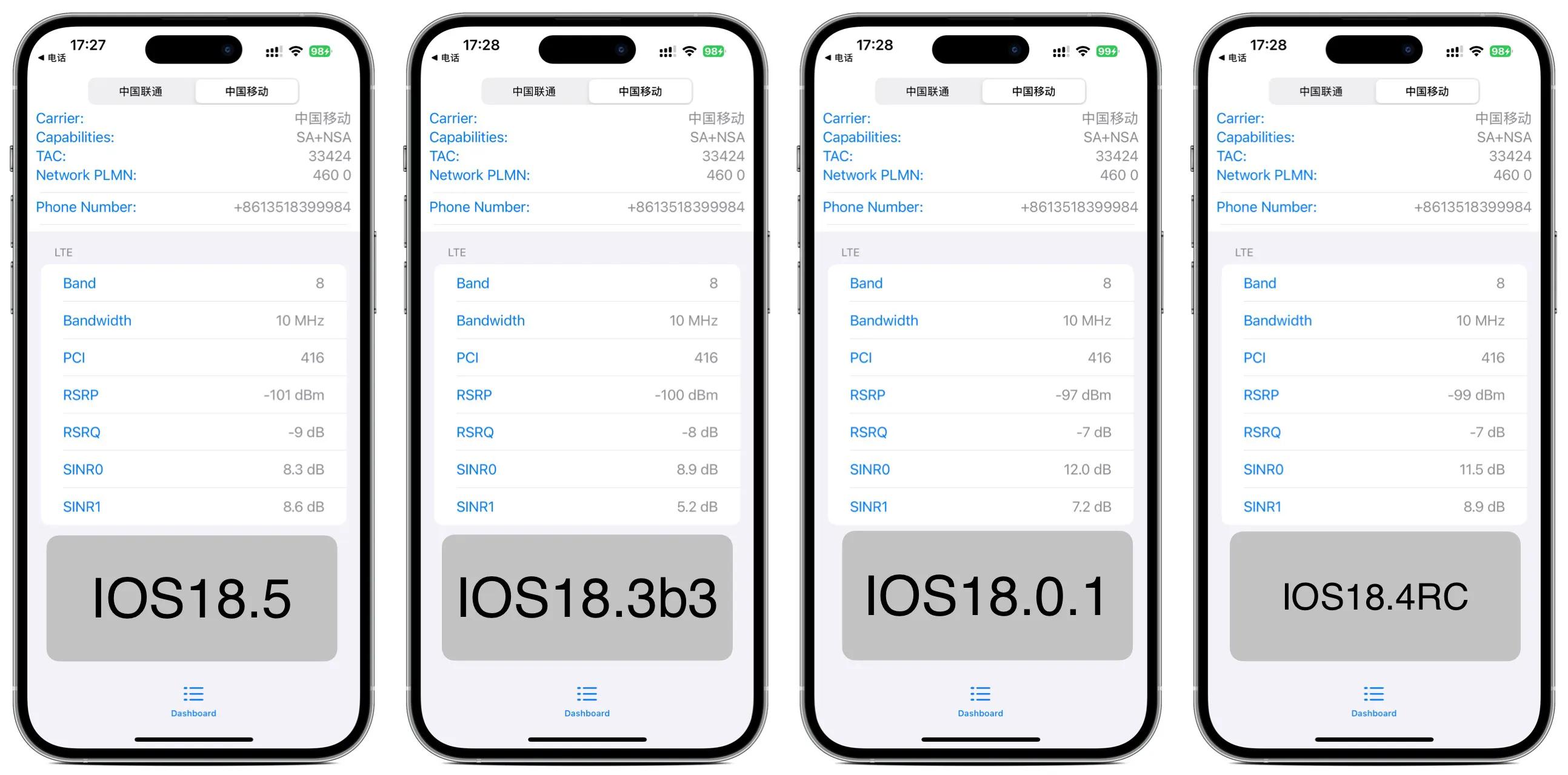 几个版本中,IOS18.3beta3的信号数值是最好的,IOS18.5中规中矩,虽然数值上有一点区别,但实际上任何区别,信号弱的地方一样没信号,微信该转圈圈还是一样的转。