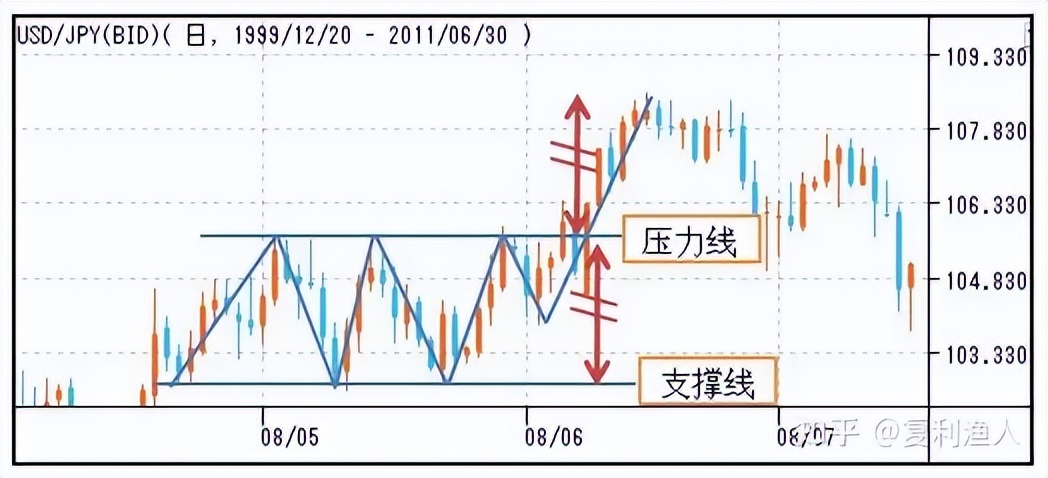 矩形上边高点的连线称为压力线,下边低点的连线称为支撑线。矩形形态在大多数场合中是以整理形态出现的(但在有些情况下,矩形也可以反转形态出现),当价格的收盘价完全突破上方的压力线时(一般为超出矩形整理形态最高点的3%左右),通常称为上升矩形形态;当价格的收盘价完全突破下方的支撑线时(一般为低出矩形整理形态的3%左右),通常称为下降矩形形态。其突破的高度至少为矩形本身的高度。