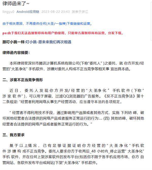 除李跳跳外,记者还发现有不少功能类似的软件都在近期停更了,比如“叮小跳”,运营方“羊小蜜”在8月初发文表示因相关原因不再提供“叮小跳”下载并停止运营。负责大圣净化与一指禅下载与运营的Android应用链在8月22日也发布公告表示自己收到了律师函,原因为“涉嫌不正当竞争情形”,Android应用链公开了委托方为深圳市腾讯计算机系统有限公司。