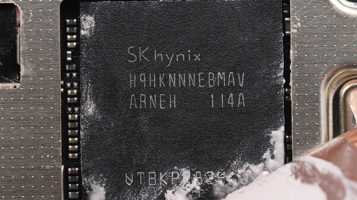 主板一面右侧是很大的屏蔽罩,贴有散热铜箔,中心以及左下角区域都涂有导热硅脂进一步帮助导热。