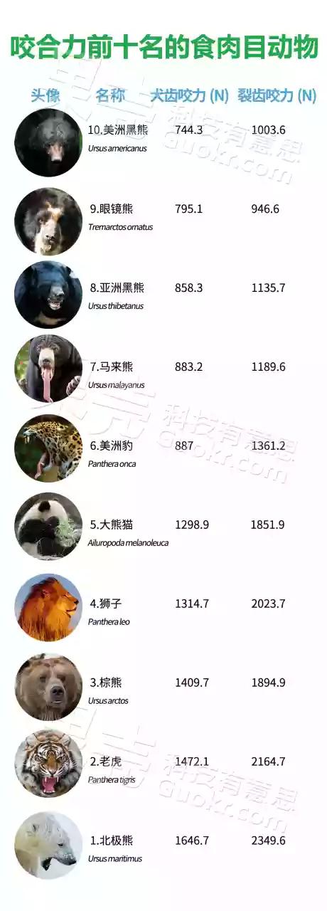 大熊猫现在虽然吃竹子,但它们确是食肉动物。大熊猫属于食肉目、熊科、大熊猫亚科和大熊猫属唯一的哺乳动物,头躯长1.2-1.8米,尾长10-12厘米。体重80-120千克,最重可达180千克,大熊猫有尖锐发达的犬齿、单室胃、较短的肠道和肉食动物的消化生理特点。虽然现在它们吃竹子食性改变,但消化能力依然保存下来,关于熊猫的咬合力,排在世界食肉动物中的第五,攻击力杠杠的。