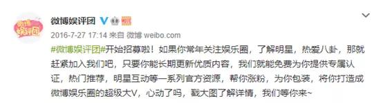 「微博当时是这么给我画饼的。」他介绍说,2016年,新浪微博推出了扶持项目「微博娱评团」,为娱乐类博主提供热度推荐、涨粉、线下活动、商业推广等一系列诱惑十足的好处。