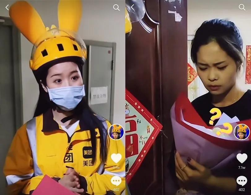 而除了奇葩订单合集,范珍香还常常拍一些才艺展示、骑手段子、送餐心情分享、与其他骑手合拍等的视频。她会因为女神节收到站点兄弟的玫瑰花而开心,也会因为在下雪送餐时收到顾客的打赏而雀跃。