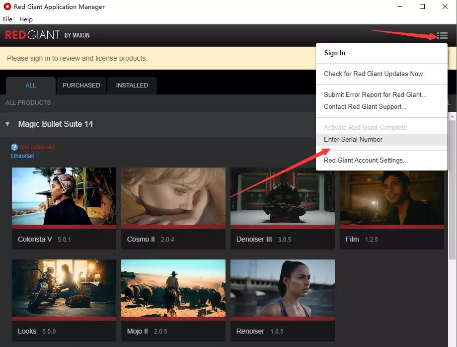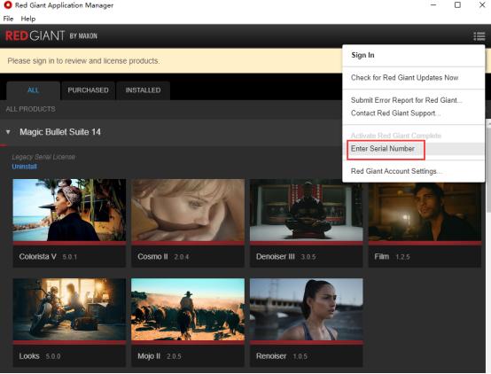 2、安装结束时,点击左下角蓝色的Activate激活按钮,在弹出Red Giant Application Manager中点击Cancel(无需登录),然后点击右上角的按钮,选择Enter Serial Number,依次输入插件序列号完成注册激活。