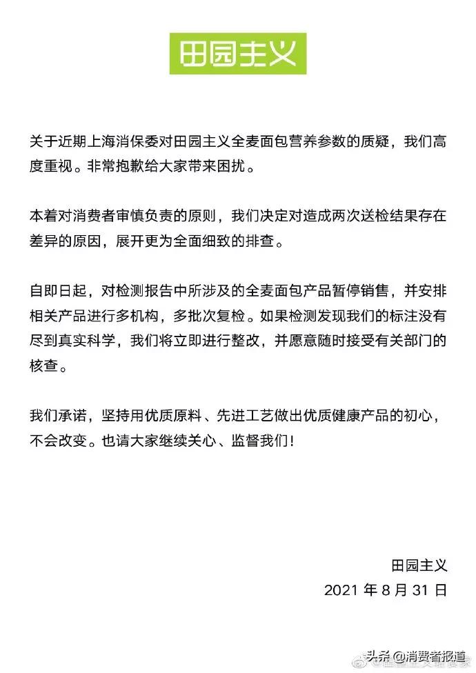 同日晚,田园主义品牌方再度回应,自即日起,对检测报告中所涉及的全麦面包产品暂停销售,并安排相关产品进行多机构多批次复检。并表示如果检测发现标注没有尽到真实科学,将立即进行整改,并愿意接受有关部门的核查。