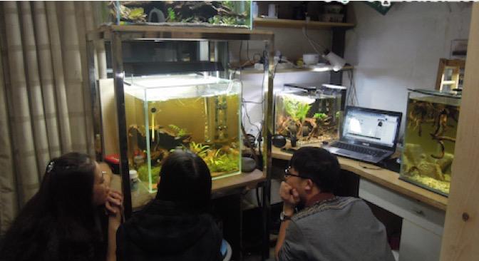 鱼缸造景是他们更进一步的追求。廉价的塑料水草首先被排除在外,苔茵山石,都要亲力亲为。