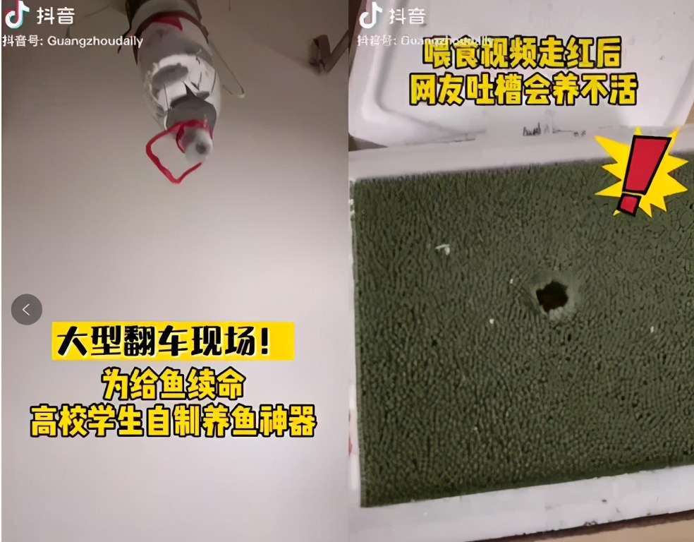 不要老搞一些奇思妙想,害鱼不浅。这位大学生在天花板上吊的自动喂食瓶,就差点把鱼给撑死。