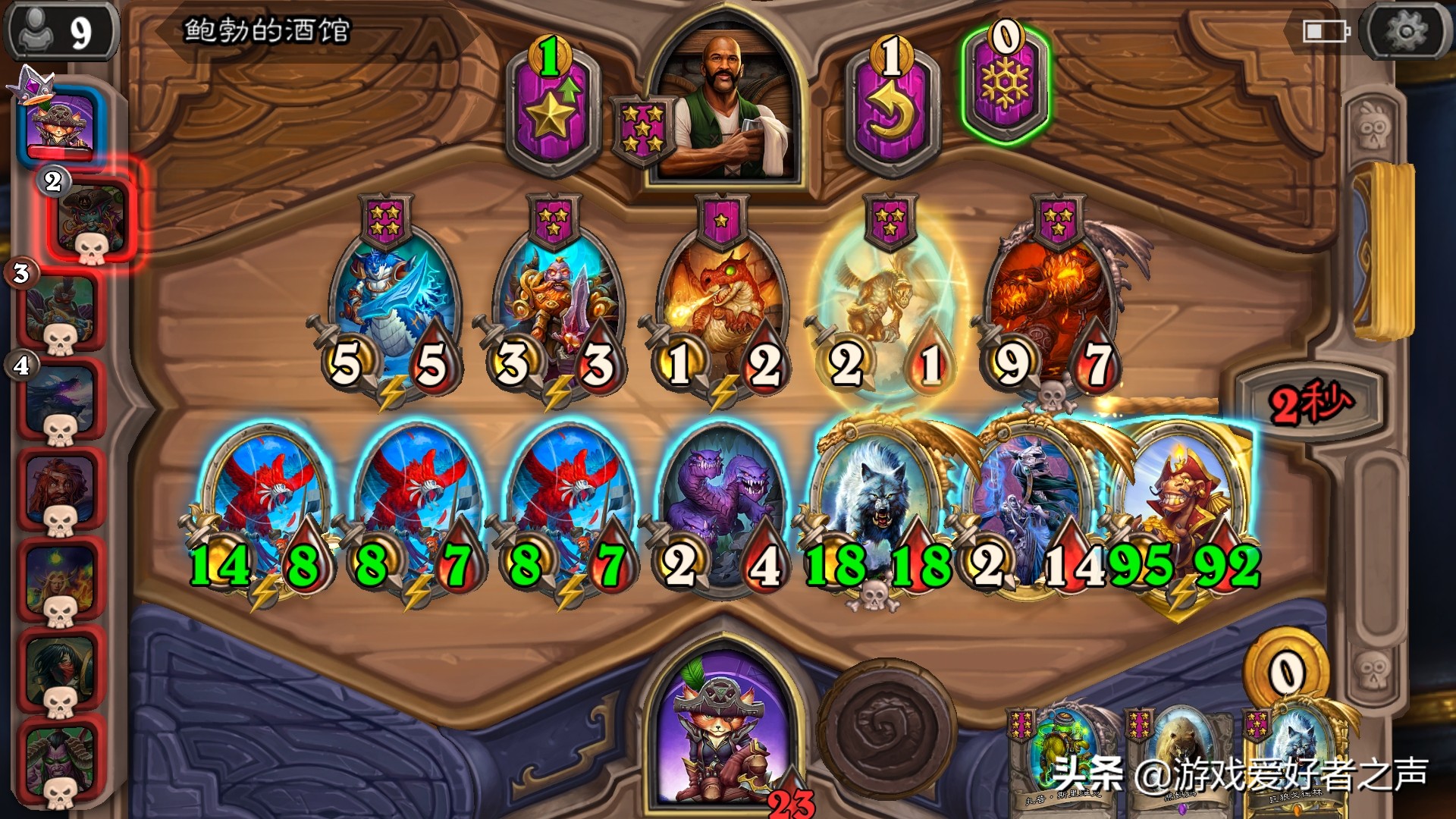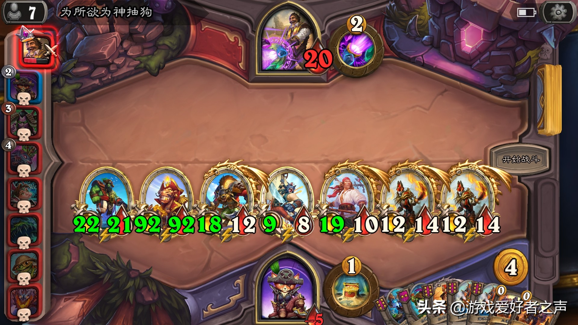 这个版本节奏快,主要还是海盗抬人太猛了。中期一波完美团,都能血入20+,后期钓鱼王和海盗船超常发挥,一波30-40,直接人没了,从第一到速8,只要一回合而已。