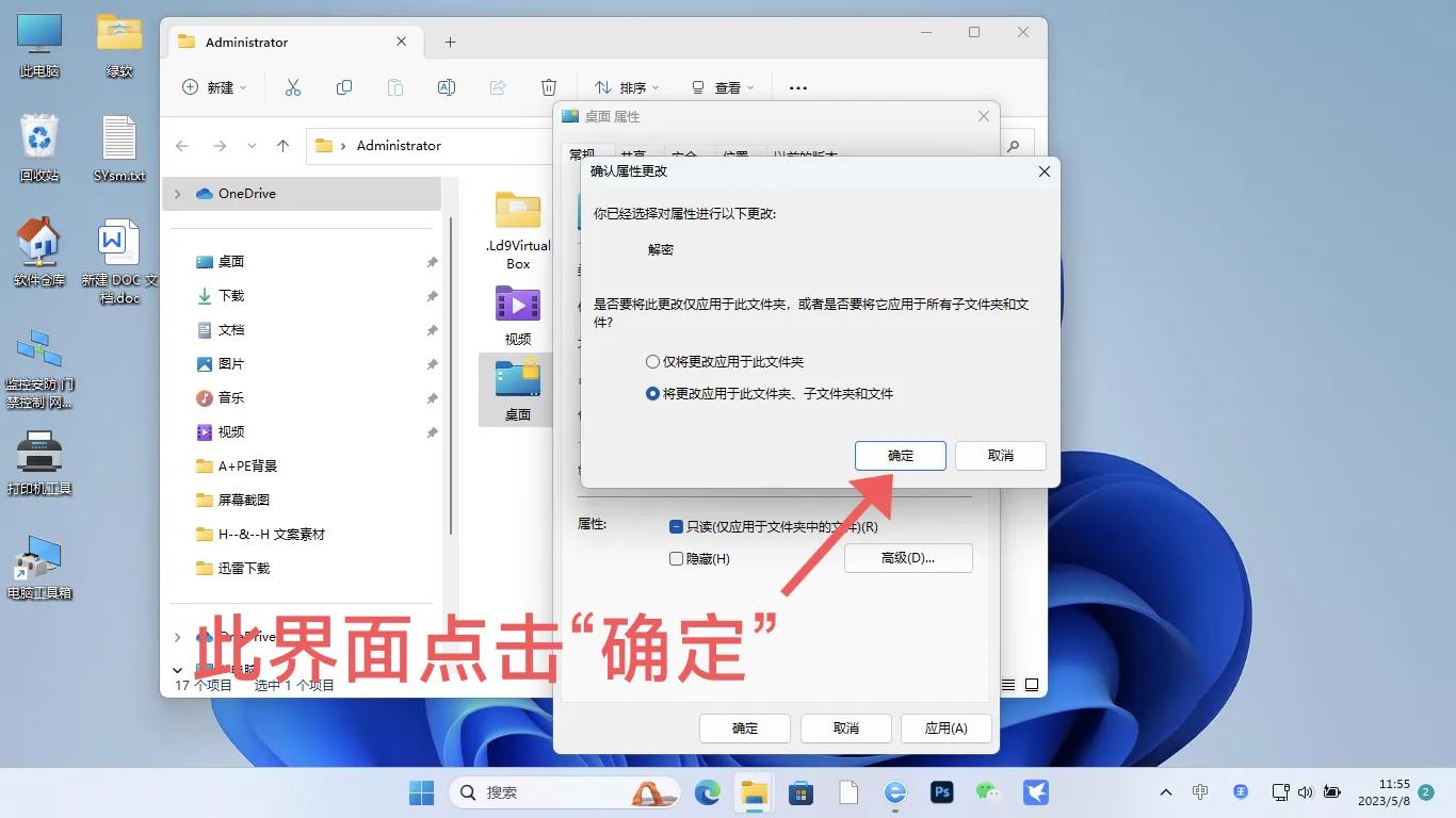 ⑤弹出(确认属性更改)的界面,点击“确定”,等待更改完成点“确定”即可。如下图: