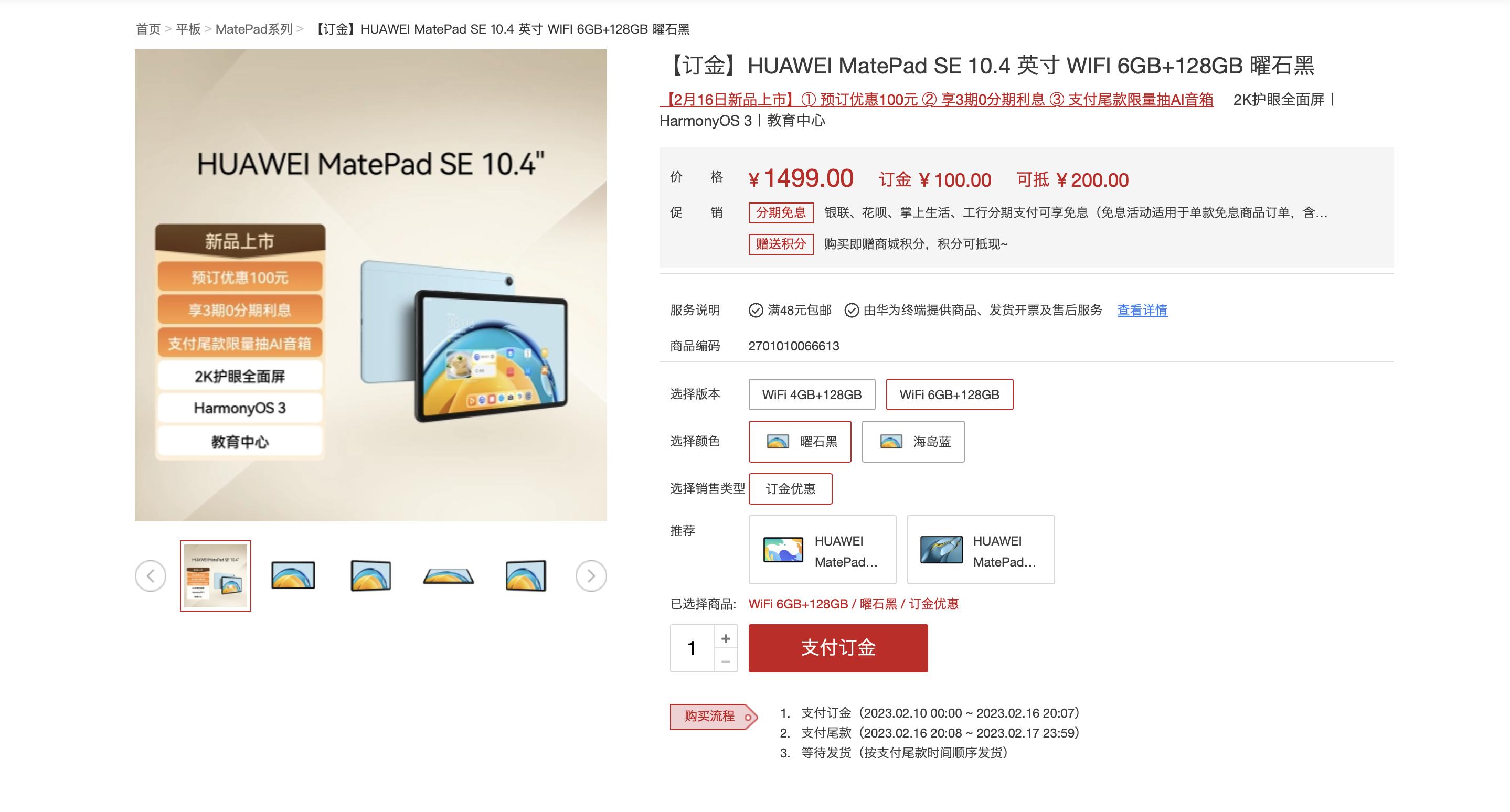 HUAWEI MatePad SE 10.4 英寸平板电脑于今日上市。从平板的命名可以看出这是一款主打入门级的平板电脑。4GB+128GB版本售价1299元,6GB+128GB版本售价1499元,提供曜石黑和海岛蓝两个配色。今天起至2023年2月16日20:07支付定金100元可抵200元,更支持享3期0分期利息 ,支付尾款限量抽AI音箱。在2月16日正式发售。