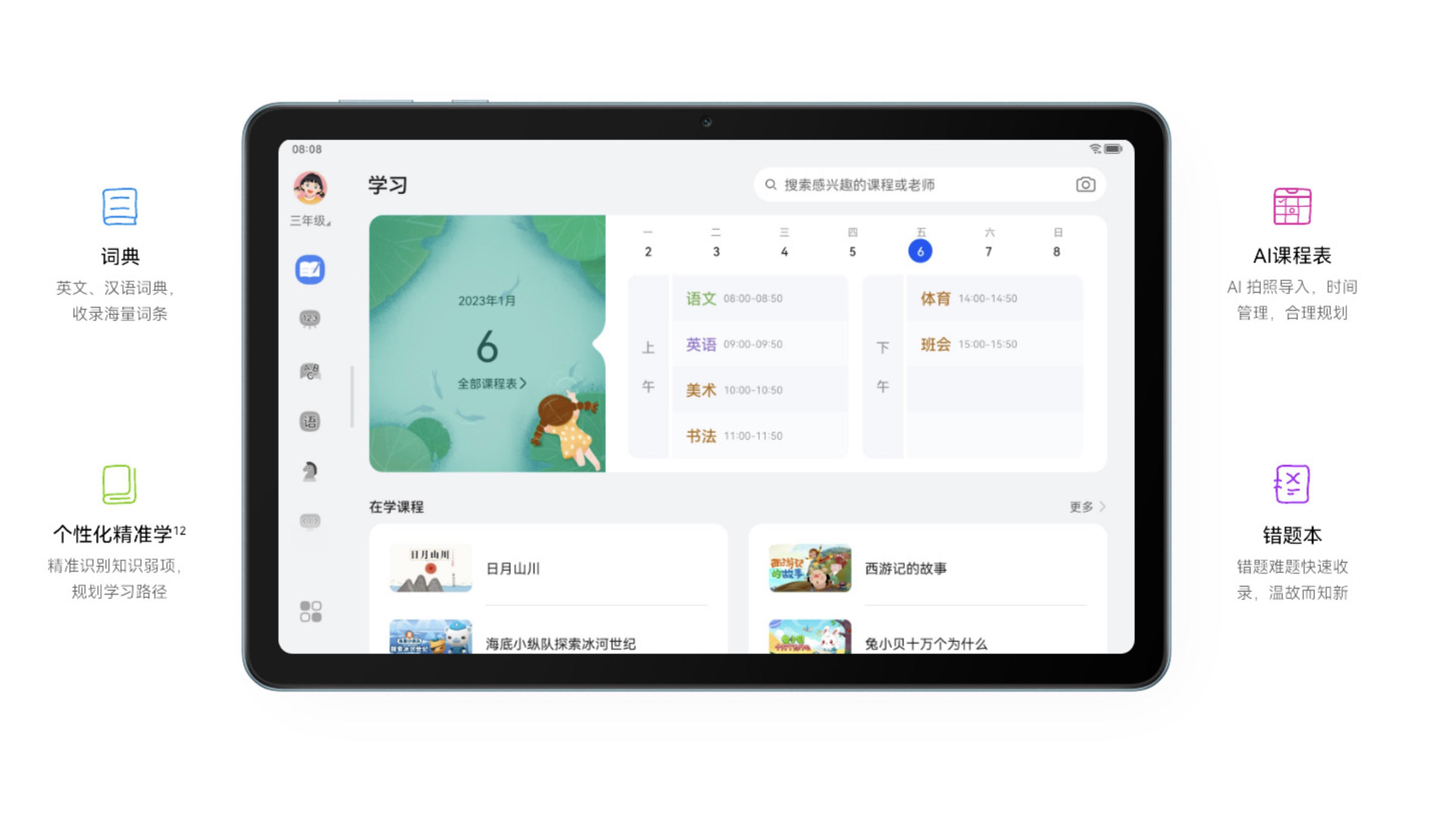 家长通过手机端的教育中心 app,即可轻松规划孩子的课程表,同步到孩子使用的平板端,同时远程设置孩子的使用时长、可访问应用和内容,帮助孩子养成健康使用习惯。