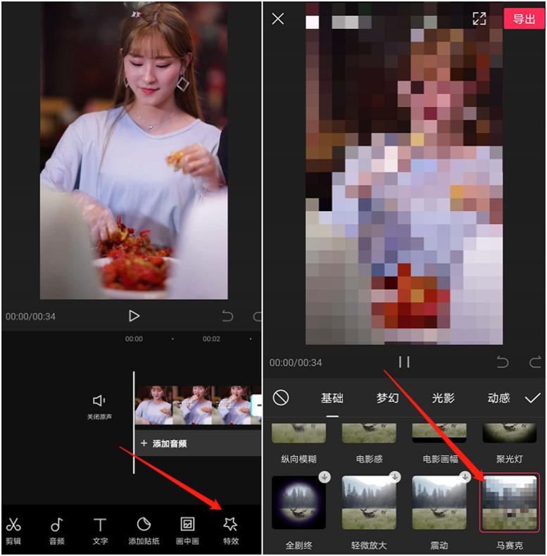 如下图所示,特效模板中有一个【马赛克】特效,选中【马赛克】特效,对应的画面变成了马赛克,但还没完;
