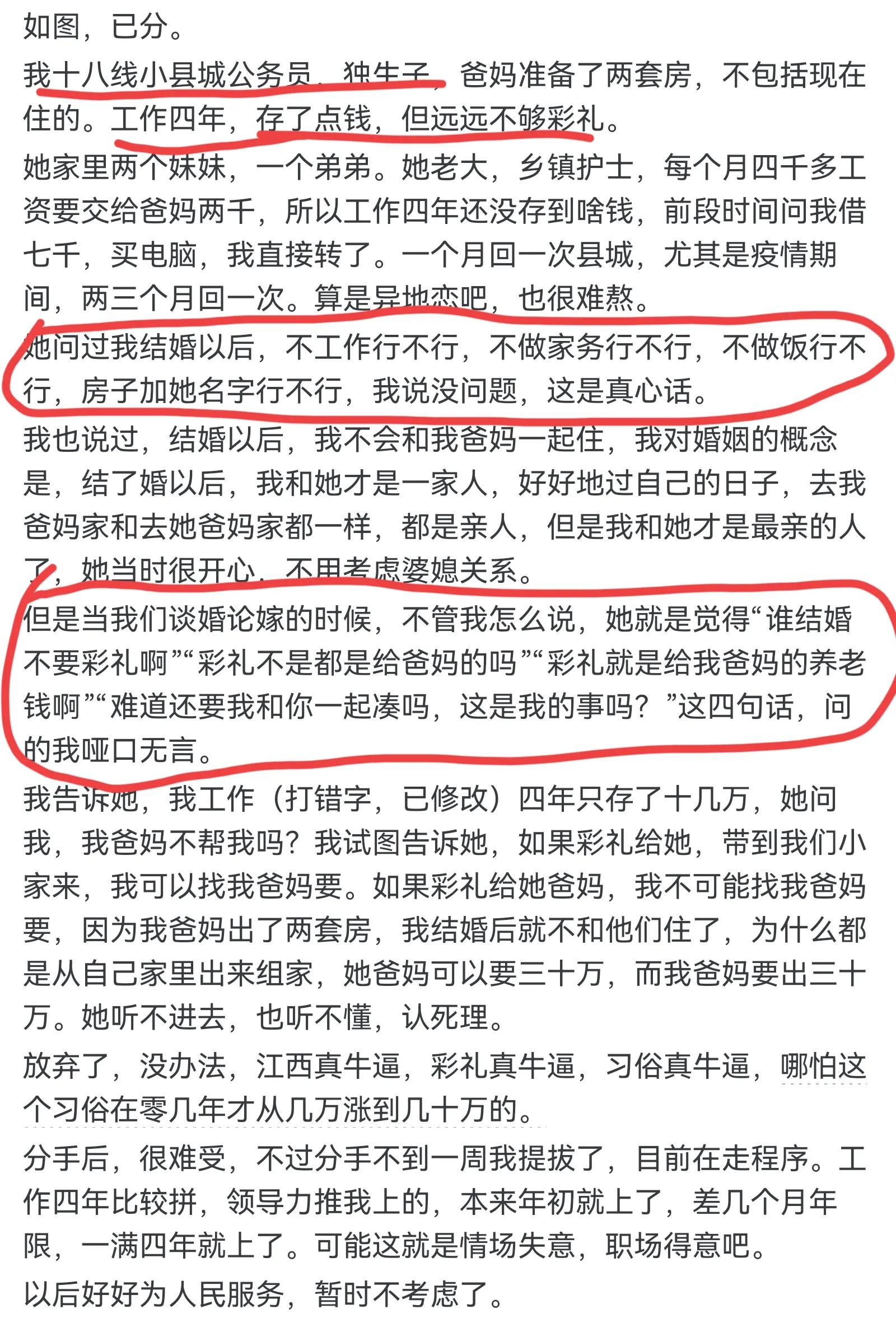 不是地域黑,是真事。基本差不多,20年的时候自己搞工作室,一个月平均三万收入。那时候谈了一个南昌本地的,要求全款一套房子,没说加名字(估计后面会说),然后三十万彩礼,五金,女方办酒钱,(必须五星大酒店),亲戚小孩一个人给两千。理由是她家亲戚都是有钱人,当官的当官,老板的老板,就她爸妈混的最差,要她来翻身了。