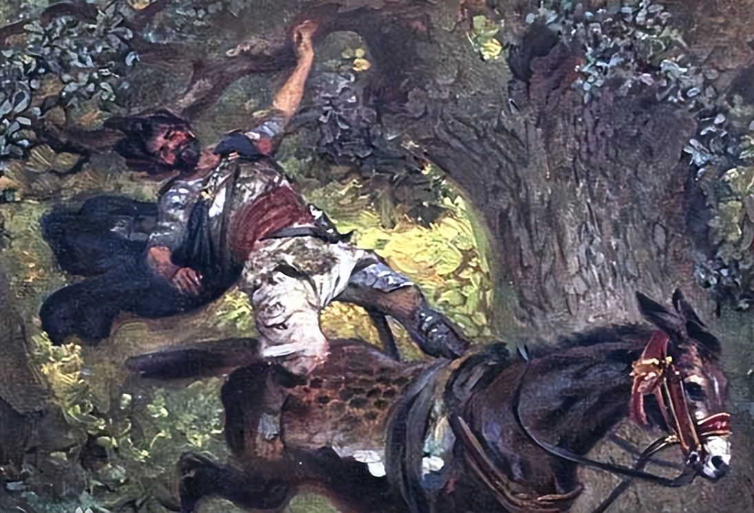 当他经过一个橡树林的时候,越过一个小坑,他的马往前一跳,落了下去,头发飞扬起来,挂到了树枝上,亚沙龙被吊在树上,这时约亚将军追上来,一枪便把王子给刺死了。