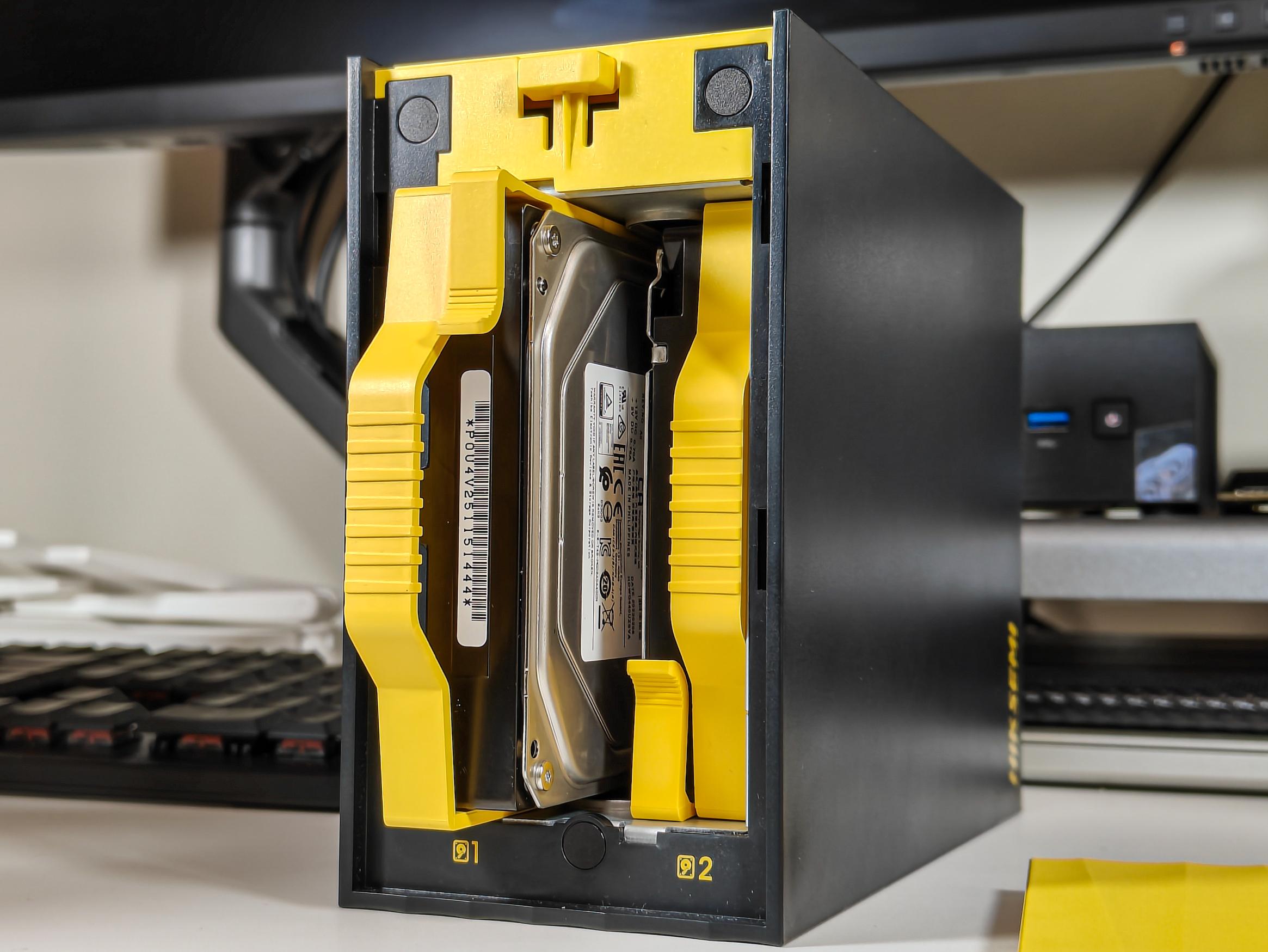 除了乔思伯N2以外,海康存储Mage20 Pro硬盘笼应该是我见过的第二个非主流设计了,半截的设计只支持插入3.5寸硬盘,不过问题不大,应该没人买2.5寸机械硬盘给NAS用。