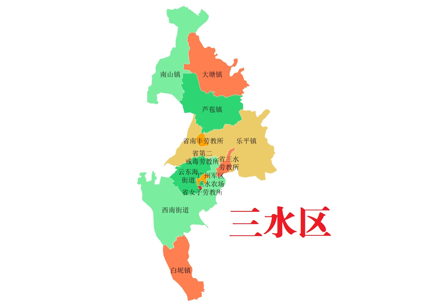 三水区总面积827.69平方千米,下辖2个街道(西南街道、云东海街道)、5个镇(大塘镇、芦苞镇、白坭镇、南山镇、乐平镇)。2021年,三水区户籍人口47.91万人、常住人口80.92万人。