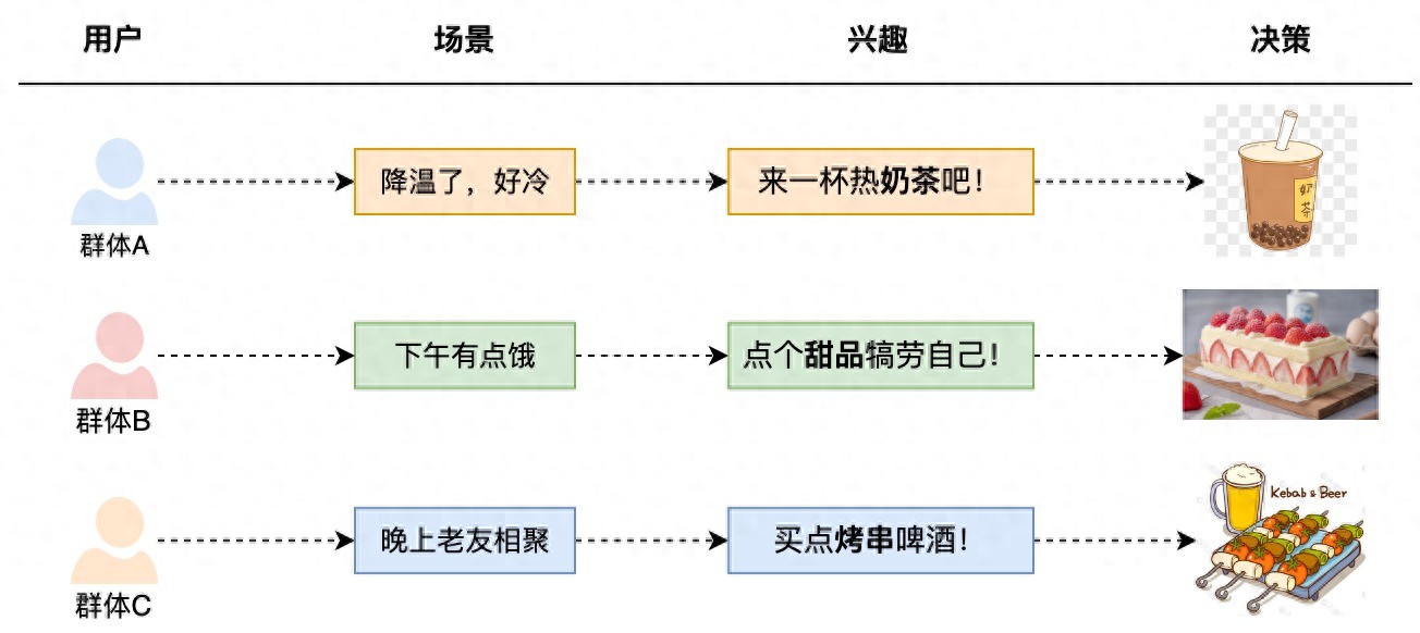 相较于传统电子商务,用户兴趣在外卖业务下呈现出更加明显的场景化特点,具备【用户-场景-兴趣-决策】链路:即用户在特定场景下,结合自身需求与个人饮食兴趣,产生决策。