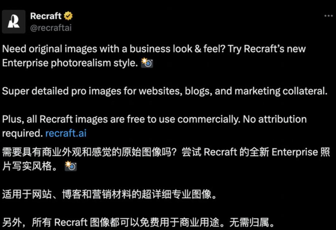 因为Recraft生成的图像允许免费商用,做的梗图能直接用于社媒配图。博主们苦AI生图版权问题久矣,现在用得自由自在,都给Recraft当上了自来水,使他家一时间跃升为掌管流量的神。