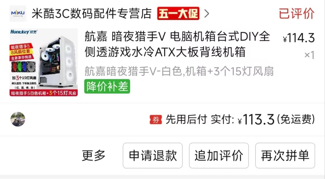 机箱选择了暗夜猎手V白色,不得不说,颜值过关,就是内部有点挤。因为我是先在机箱正面安装了风扇,结果因为机箱小,无法在顶部安装水冷,只能把正面的风扇拆了,把水冷安在正面,风扇按在顶部,来回折腾了一遍。