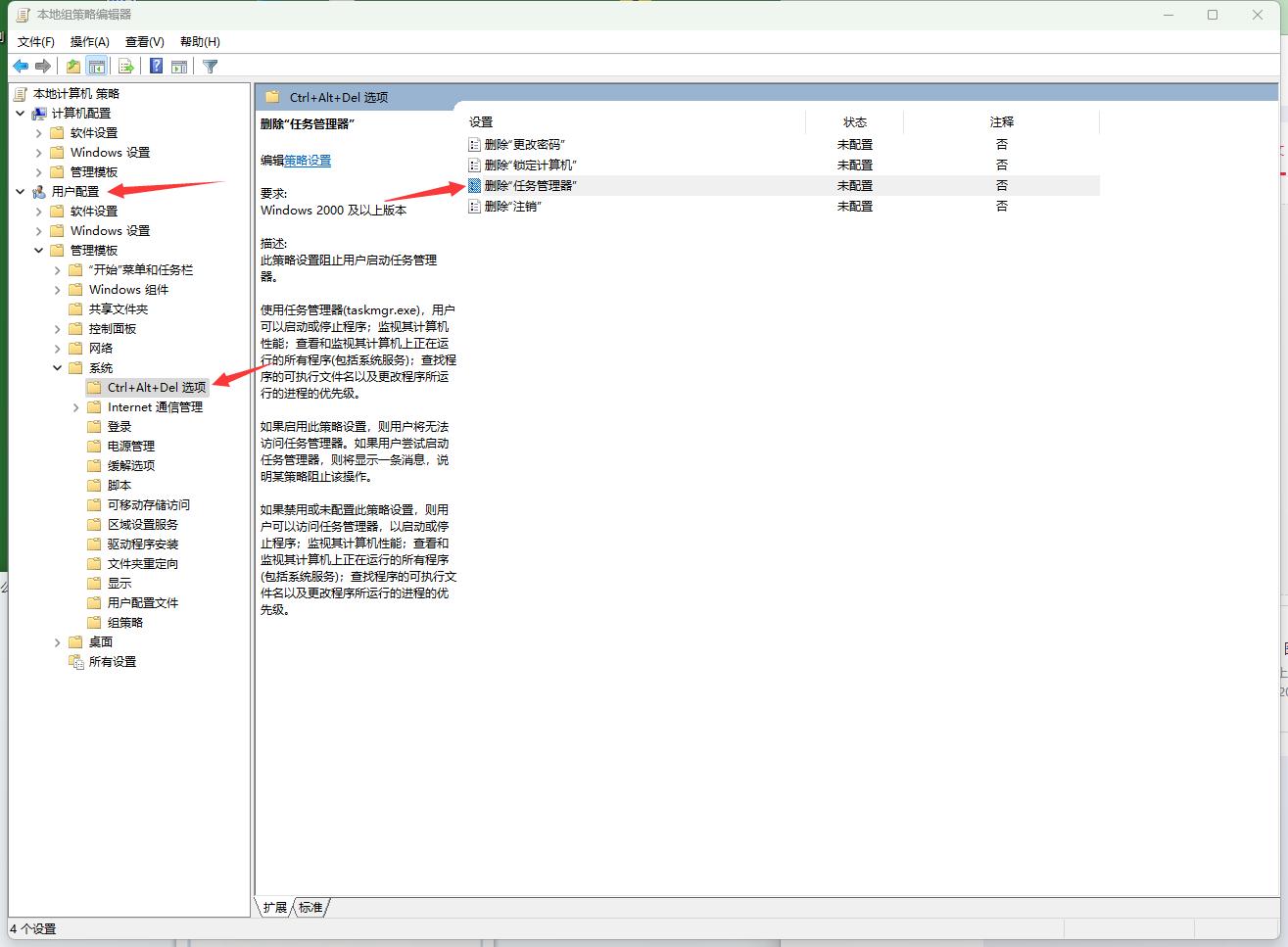 按{windows键+R键}——弹出{运行界面}——在运行界面输入{gpedit.msc}——确定或者回车——在{用户配置}找到{管理模板}——找到{系统}——点击右边的{CTRL+ALT+DEL}选项——双击{删除任务管理}——点击{已禁用}——{确定}——这样就可以了