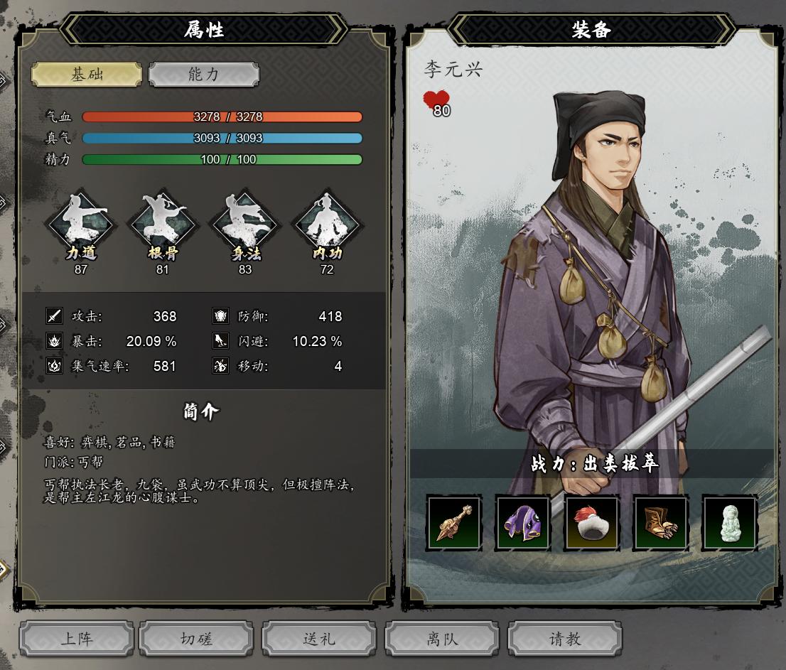 李元兴是游戏中最后一位可以入队的枪棍系队友,作为最晚入队的,他有这枪棍系队友中最高的初始属性,并且在最后个人任务结束后还会习得红色绝技:打狗棒法。从人物强度上来说他无疑是最优解,不过缺点是入队时间过晚,这时候很多玩家队伍已经成型了,所以不是喜欢他的人物塑造的话大概率也是坐板凳了。