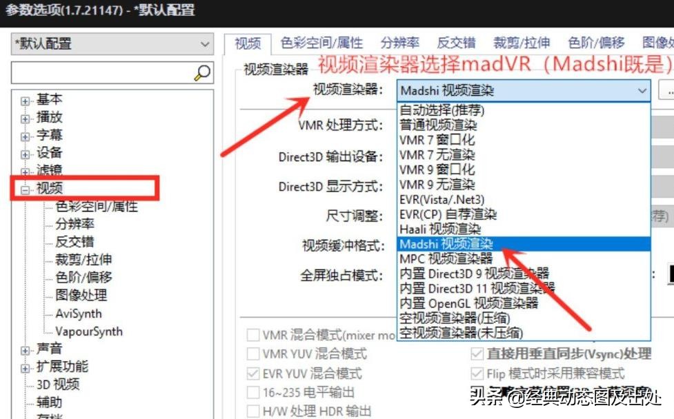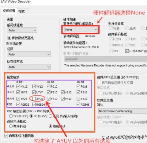 橙色框中输出格式的勾选,除了 AYUV 以外,勾选所有选项;RGB 输出格式选PC;颜色抖动模式选随机抖动,硬件解码器选择None。