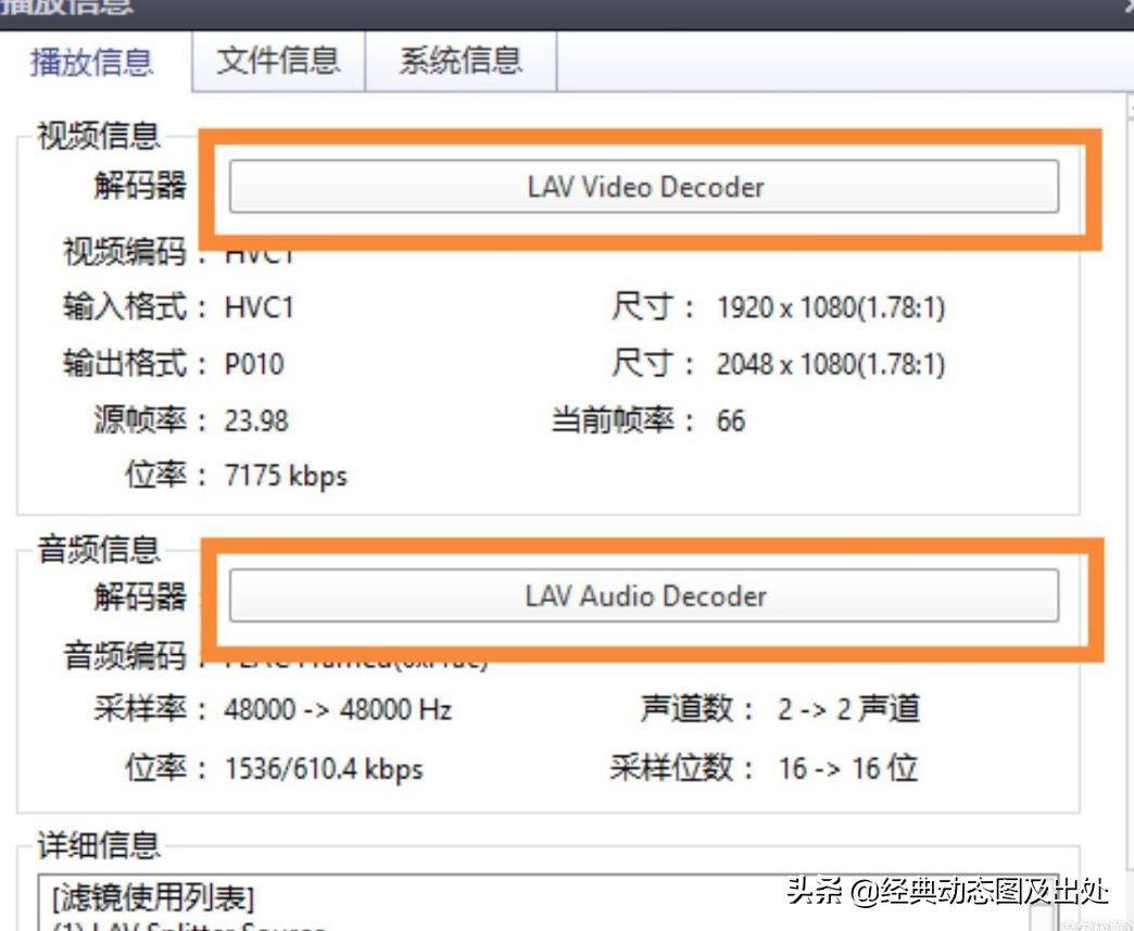 先关闭Potplayer播放器,然后再重新打开,接着随便打开一个视频,在播放界面点击右键-属性,打开下面这个界面,然后点击橙色框就能进入视频/音频解码器设置界面。