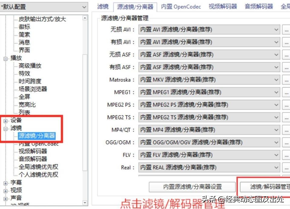 关闭Potplayer内置的滤镜,这步最为重要,鼠标点击左边切换至滤镜选项卡,防止 Potplayer对视频进行有害处理,如果不关闭内置滤镜会怎样?如果不关闭Potplayer内置的渣渣图像滤镜,数据在传递给madVR视频渲染器之前就已经从 10-bit 砍成 8-bit了, 精度损失非常大,那么你的madVR渲染器精度再高也是白搭。