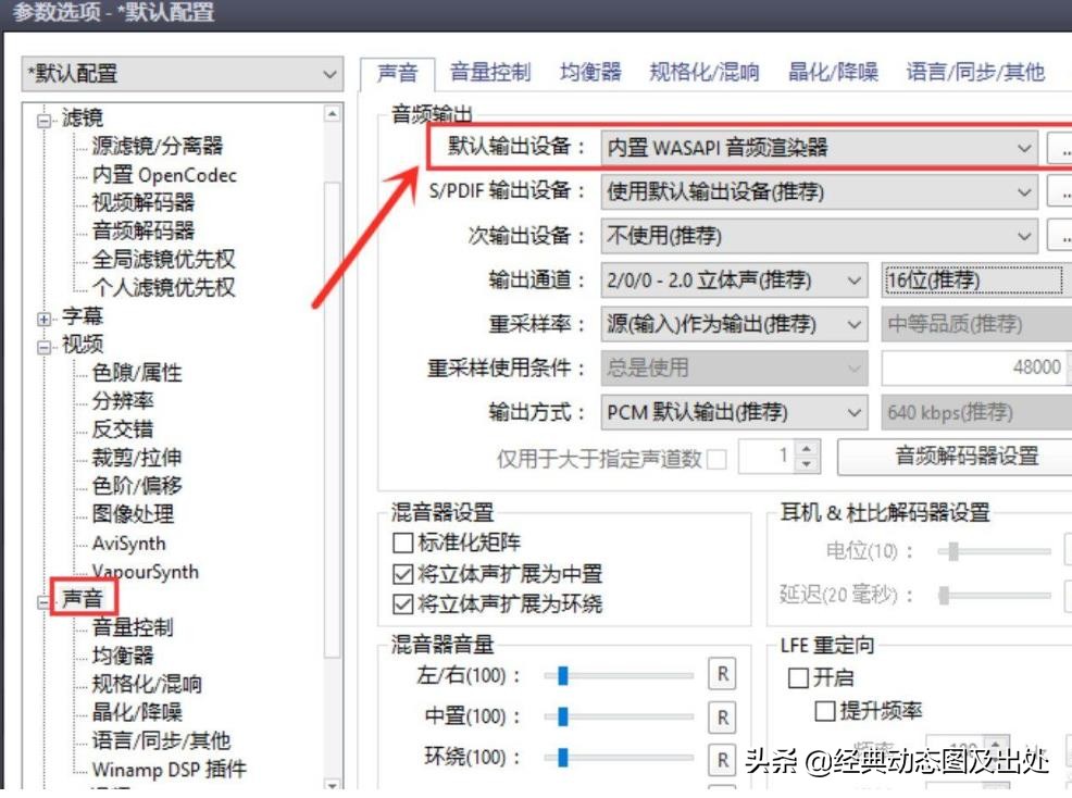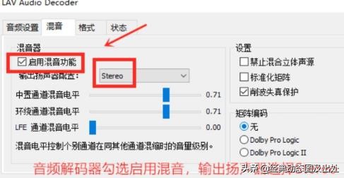 音频解码器LAV Audio Decoder启用混音功能,然后输出扬声器配置选择Stereo即可