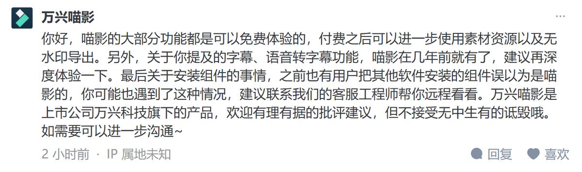结果万万没想到,引起了官方人员的注意,万兴喵影官方在两个小时之内就给我了一个不卑不亢的回复!