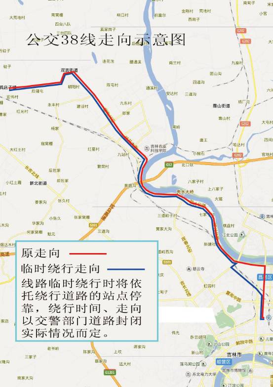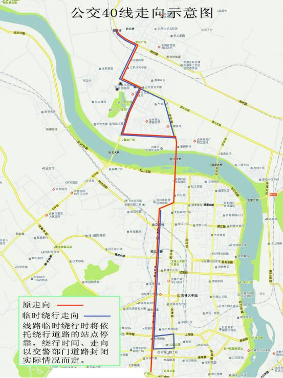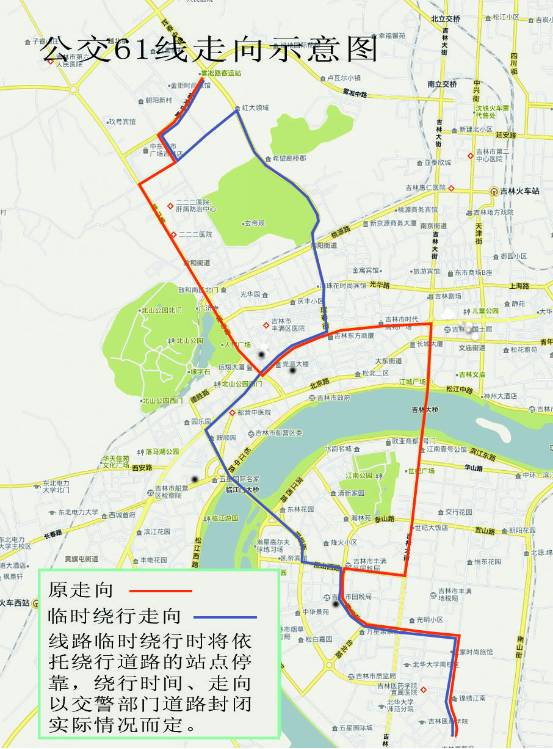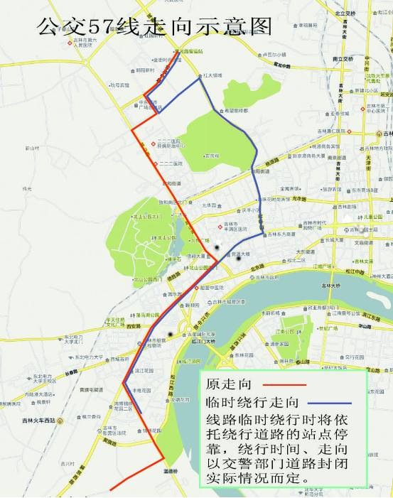 采取绕行方式。由龙山路绕行乙烯路、裕民街、滨江东路、雾凇大桥、解放北路、通潭大路、吉林大街、上海路、重庆街、解放中路、吉林大街,终到北京路。