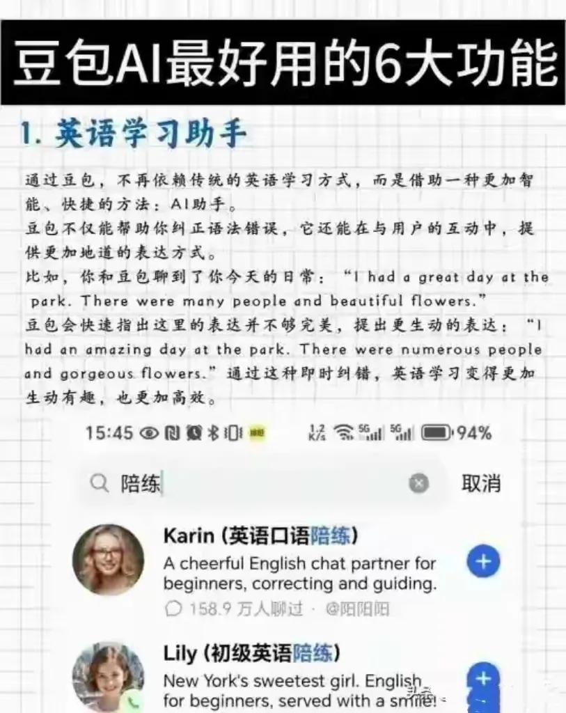 就像学英语,豆包能帮我们纠正错误,提升口语,但真正和外国人交流时那种有温度的互动,还是得靠我们自己;写文章,豆包能给我们思路和素材,但文章里独特的想法和情感,是只有我们人类才能写出来的。
