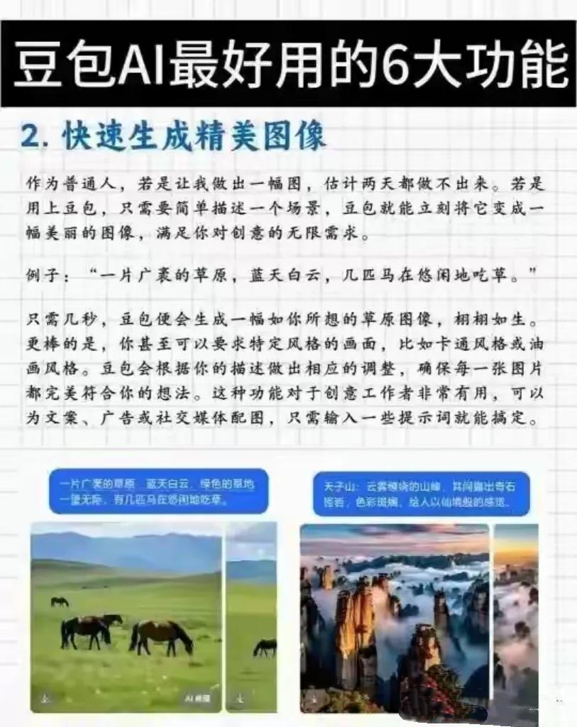 后来他听说了豆包,就想着试试看。他在豆包里输入“一片大大的草原,蓝天上飘着白云,几匹马在慢悠悠地吃草”,刚点发送,“叮”的一声,3秒钟!一张超美的草原图就出现在眼前了!小张觉得这图太写实,想要卡通风格的,跟豆包一说,豆包马上又给他变出来一个超可爱的卡通版。现在小张写文章,配图又快又贴合,文章阅读量一下子翻了好几倍,粉丝都追着问他是不是偷偷请了个超厉害的插画师!