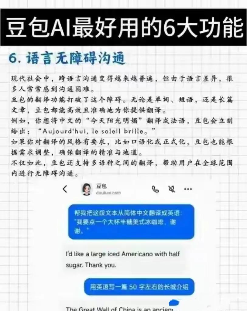 有个爱旅游的人去法国玩,在餐厅点餐时,拿着菜单一看,全是法文,一个字都不认识,当时就慌了神,站在那儿不知道怎么办才好。他赶紧拿出手机,把菜单拍下来发给豆包,豆包就像个超厉害的“翻译大师”,立刻翻译成中文,还贴心地标注出哪些菜是特色菜。这人靠着豆包,顺利点到了好吃的,还和服务员聊得挺开心!还有个做外贸生意的老板,和国外客户谈生意,邮件往来全靠豆包翻译,豆包翻译得又准,还能根据不同场合调整风格,帮老板把生意越做越大!