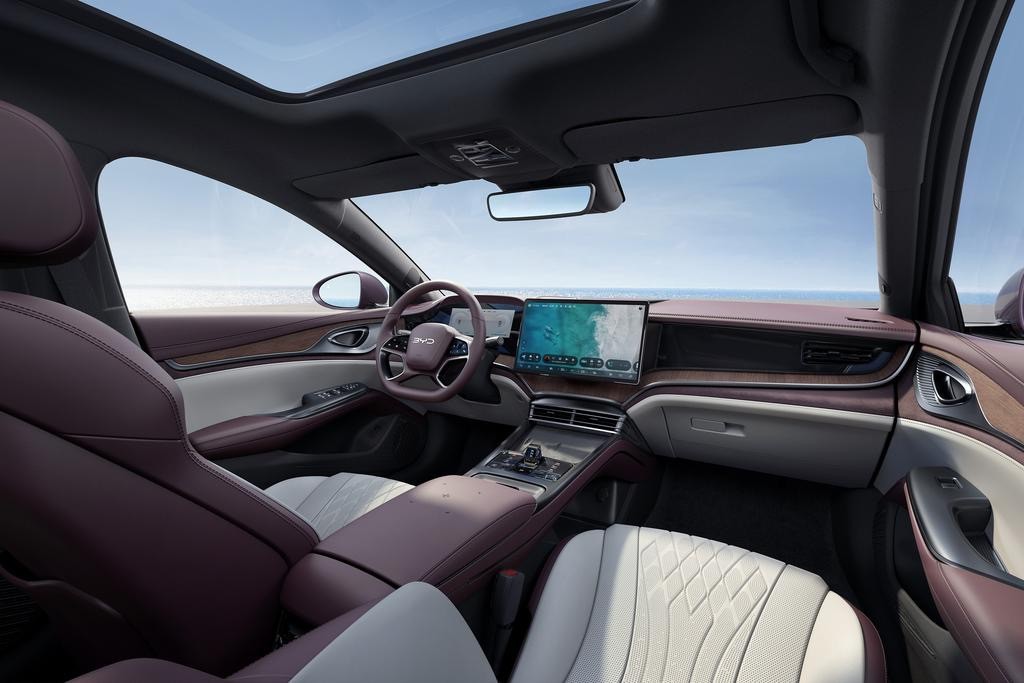 不仅仅是设计,比亚迪海豹DM-i的内饰颜色搭配也很讲究,采用的是酒红色+白色的双色搭配,而且有缝线工艺的加持,整体营造出了一种古典豪华氛围。另外,就是车内的设计变得更加柔和,每个弯角过渡的都比较圆润自然。