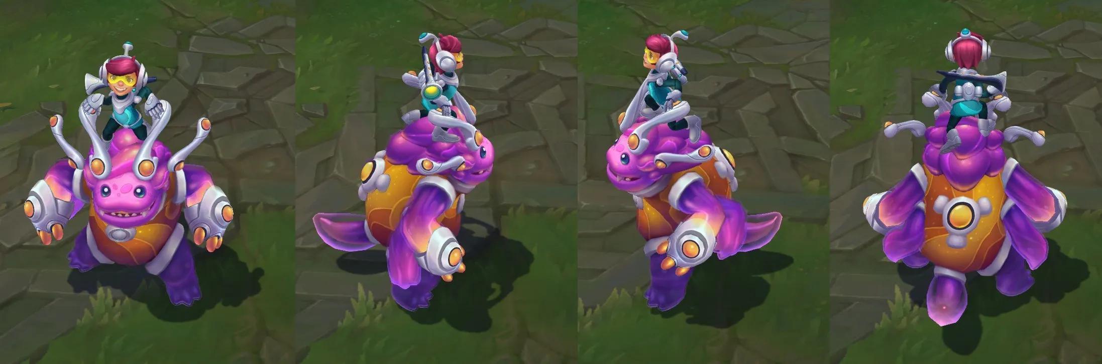 复古未来风下的努努变成一只外星生物,努努的模型很有意思,通体像扎克那样半固态半液态的“果冻质”,这也是外星生物架空题材中常见到的,体表还附上一层透明液体,尾巴处尤为明显。这款皮肤滚雪球的效果很棒,R技能在读条的时候也有bgm,回城也有这个系列皮肤主题的bgm。从主题上来说,努努和威朗普应该属于无厘头、乐天的那种。同时,也希望能提炼出他们的友谊对于彼此的真正意义。