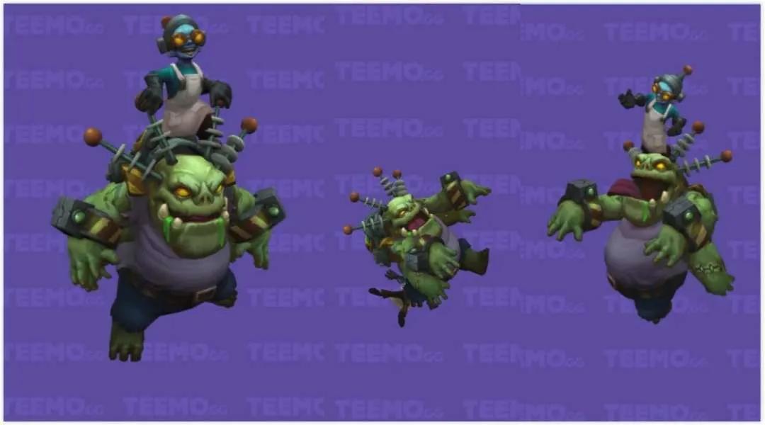 这款皮肤的作品质量比绝大部分T3要高,甚至不输给T2。因为Ctrl动作重做,语音音效翻新,R的施法动作和部分走路动作也重做了。这等工作量,洛霞和派克T2都要流口水。这款皮肤中,努努作为科学怪人型丧尸,支配下面的丧尸(威朗普)非常贴合这个英雄的角色定位。